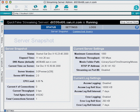 La page Web de configuration de QuickTime Streaming Server. Le paramètrage se fait par l'intermédiaire d'une page Web (sur le port 1220 de la machine Localhost). Cette façon d'opérer le rend à la fois simple, facile à mettre à jour et portable. |