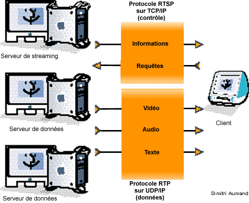 En unicast, le protocole RTP assure le transport unilatéral des données. Le seul rôle du protocole RTSP est de faire transiter requêtes et informations entre le client et le serveur. |